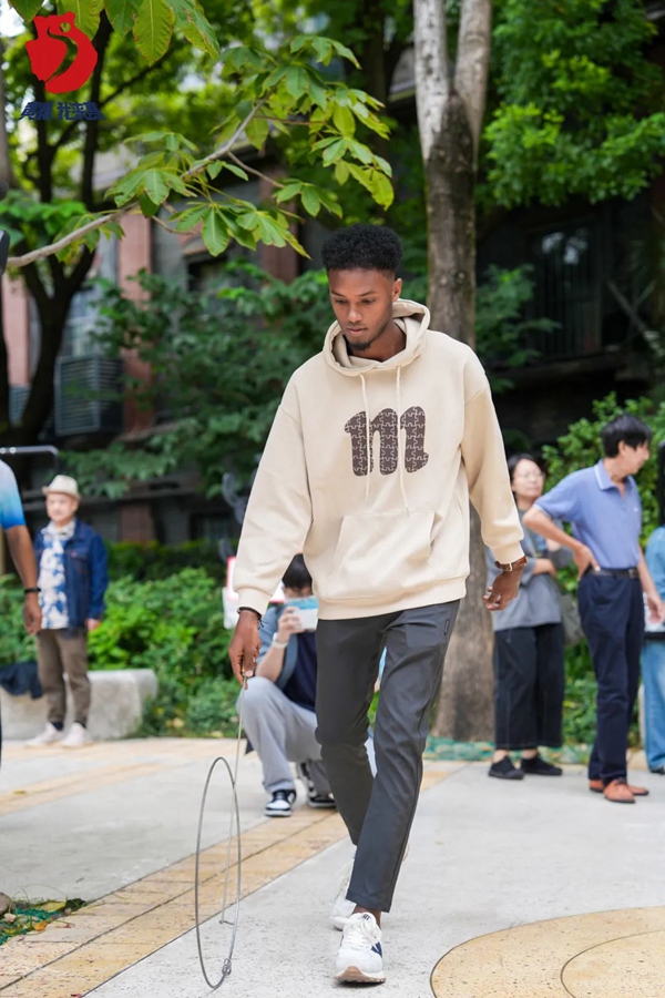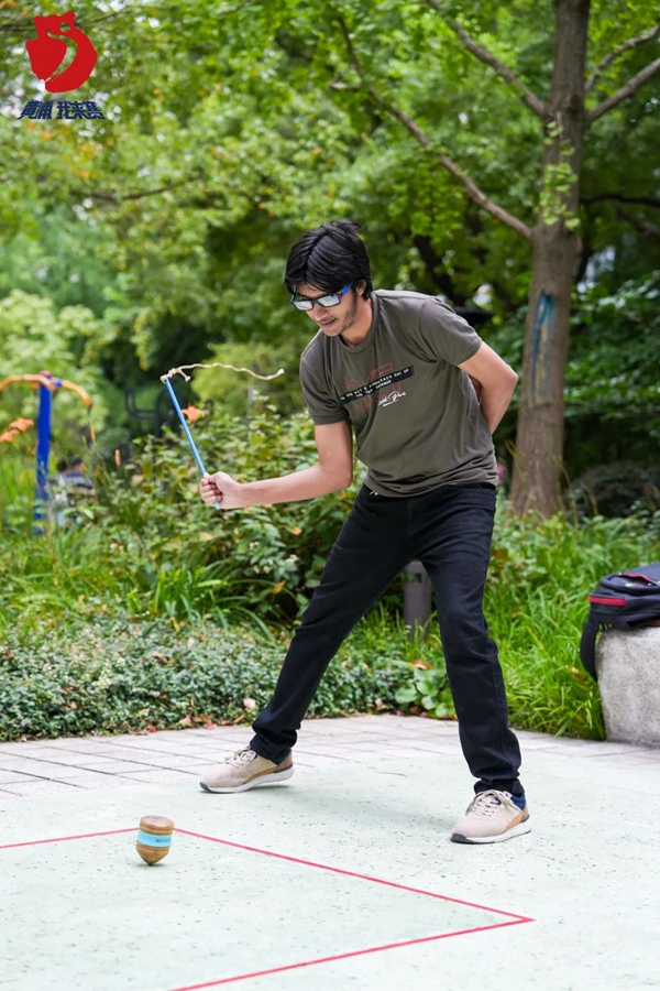 The students competed with other foreign game enthusiasts and locals in the top spinning and hoop rolling games and also experienced other games such as playing marbles, kongzhu (Chinese yo-yo) and rope jumping with surrounding residents in a sideline activity in Jiuzi Park.