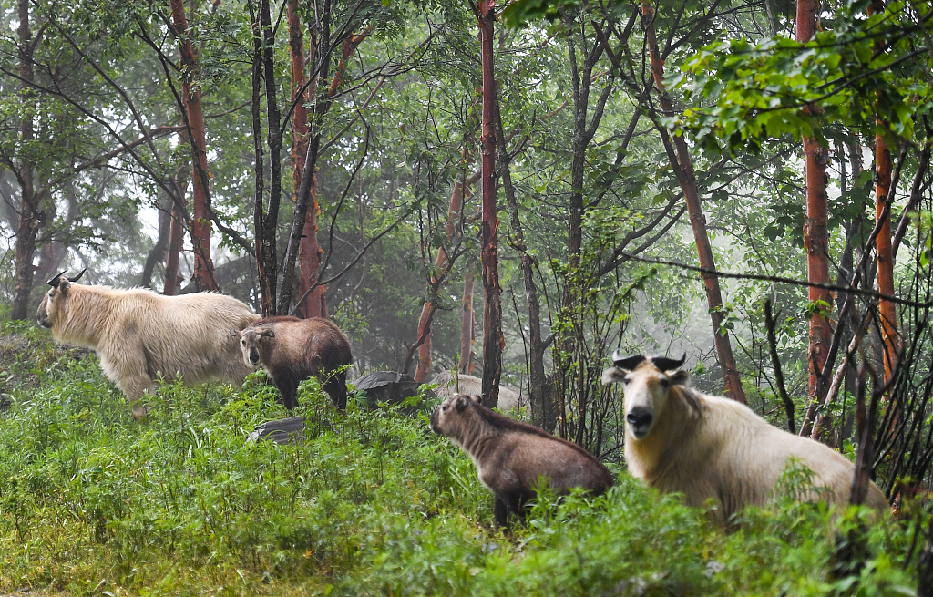 Takins at Niubeiliang National Forest Park in Zhujiawan village, Shaanxi province. [Photo/CFP]