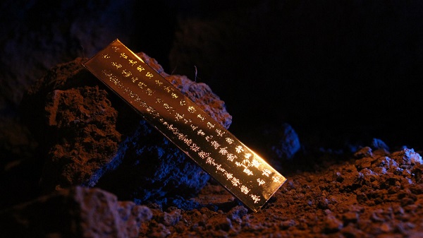 The small-sized replica of Wu Zetian gold strip from an archaeological dig box of Henan Museum. (Photo provided for chinadaily.com.cn)