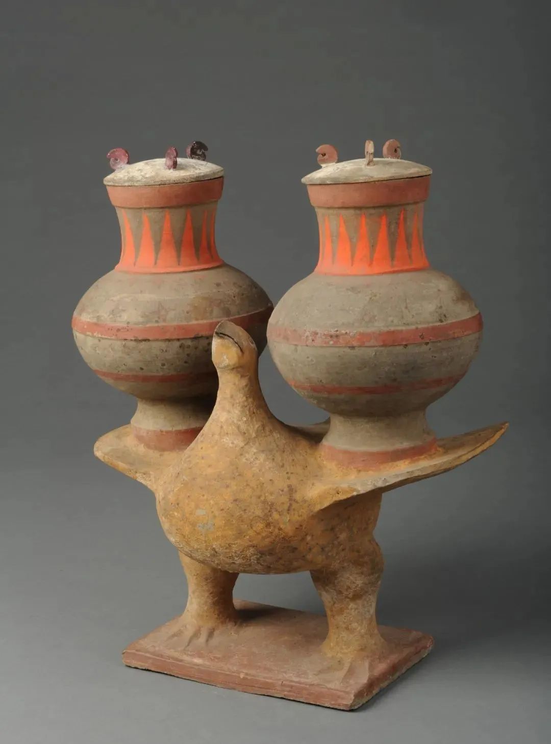 Red pottery dove holding two painted pots, Western Han Dynasty, one of the treasures of the Jinan Museum [Photo/Official WeChat account of the Shandong Provincial Department of Culture and Tourism]