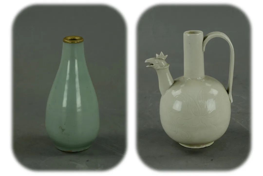 Celadon vase, Longquan kiln (L); white-glazed ewer with engraved patterns and a chicken head-shaped spout, Ding kiln [Photo/Official WeChat account of the Jinci Temple Museum]