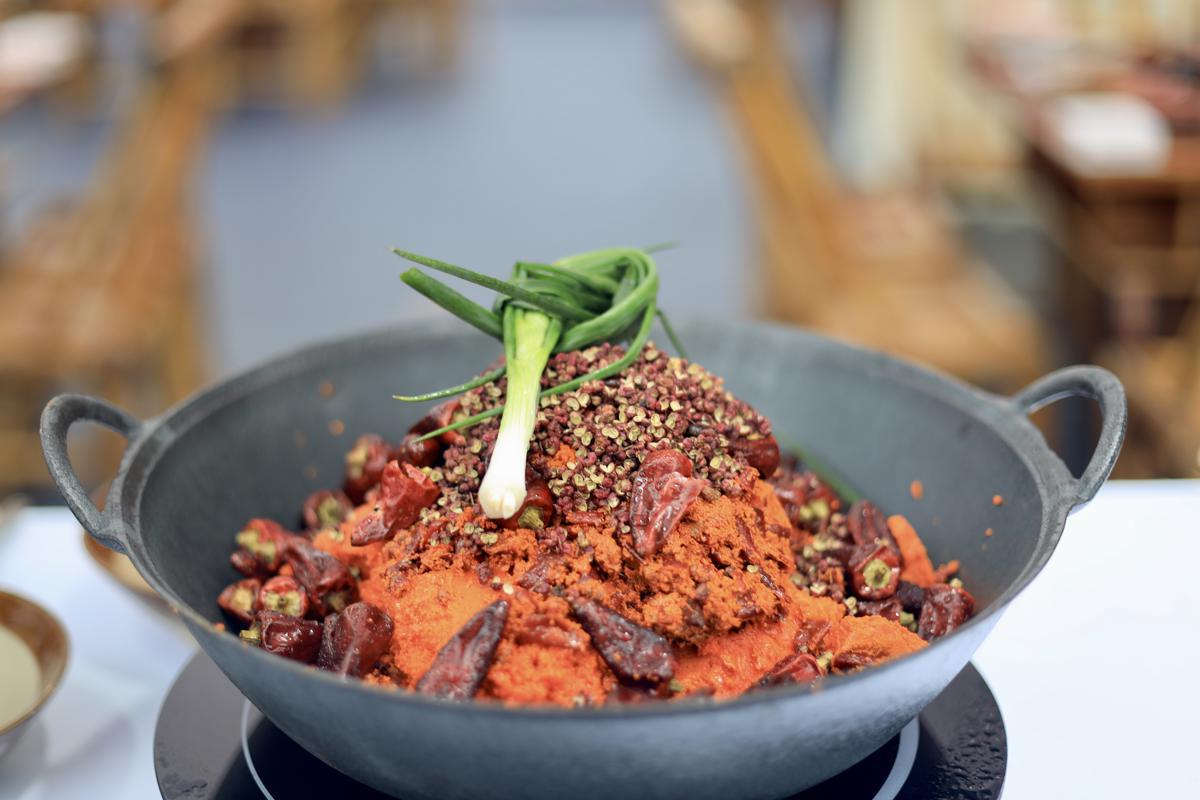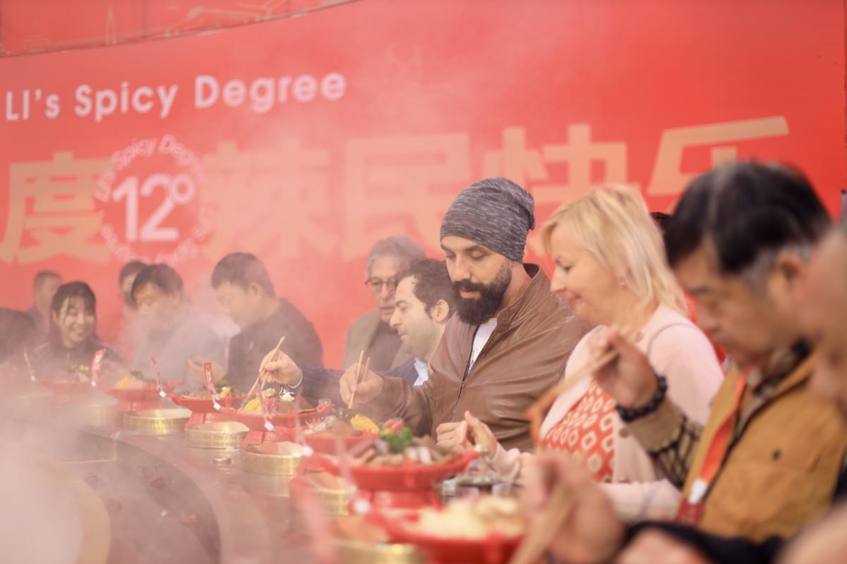 The festival features an extra large hotpot, which is 10 meters in diameter and 1.06 meter tall, and weighs in at 13 metric tons. It can serve 56 people at the same time. [Photo by Deng Rui/chinadaily.com.cn]