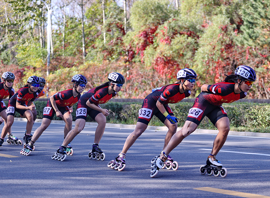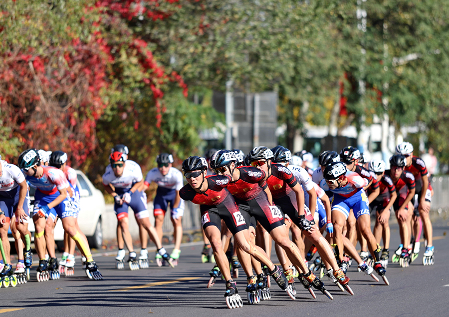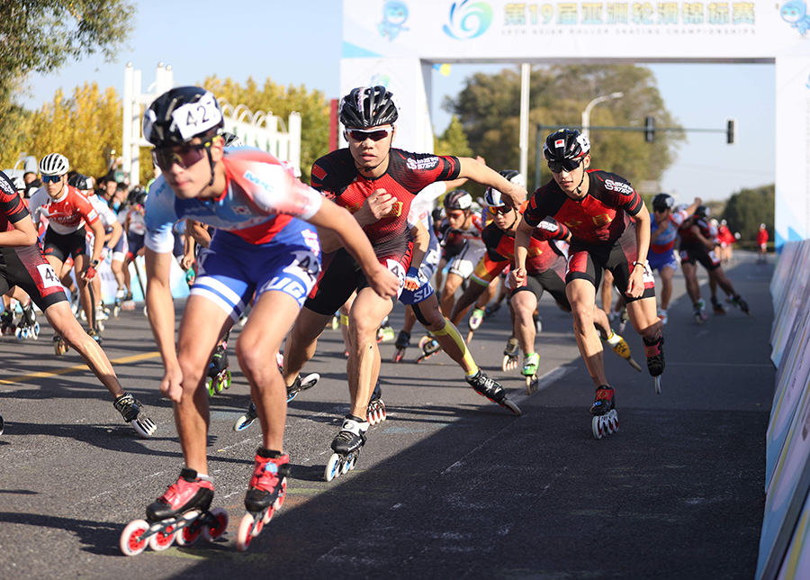 Athletes compete on the marathon track during the 19th Asian Roller Skating Championships in Qinhuangdao, North China's Hebei province on Friday. [Photo by Li Duo/For chinadaily.com.cn]