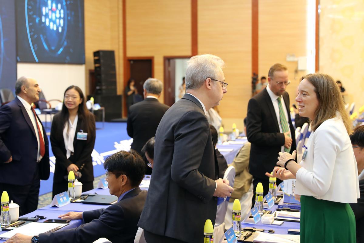 Participants of the 89th International Forum on China Reform interact on Saturday before the opening of the two-day event in Haikou, Hainan province. [Photo by Wang Zhuangfei / China Daily]