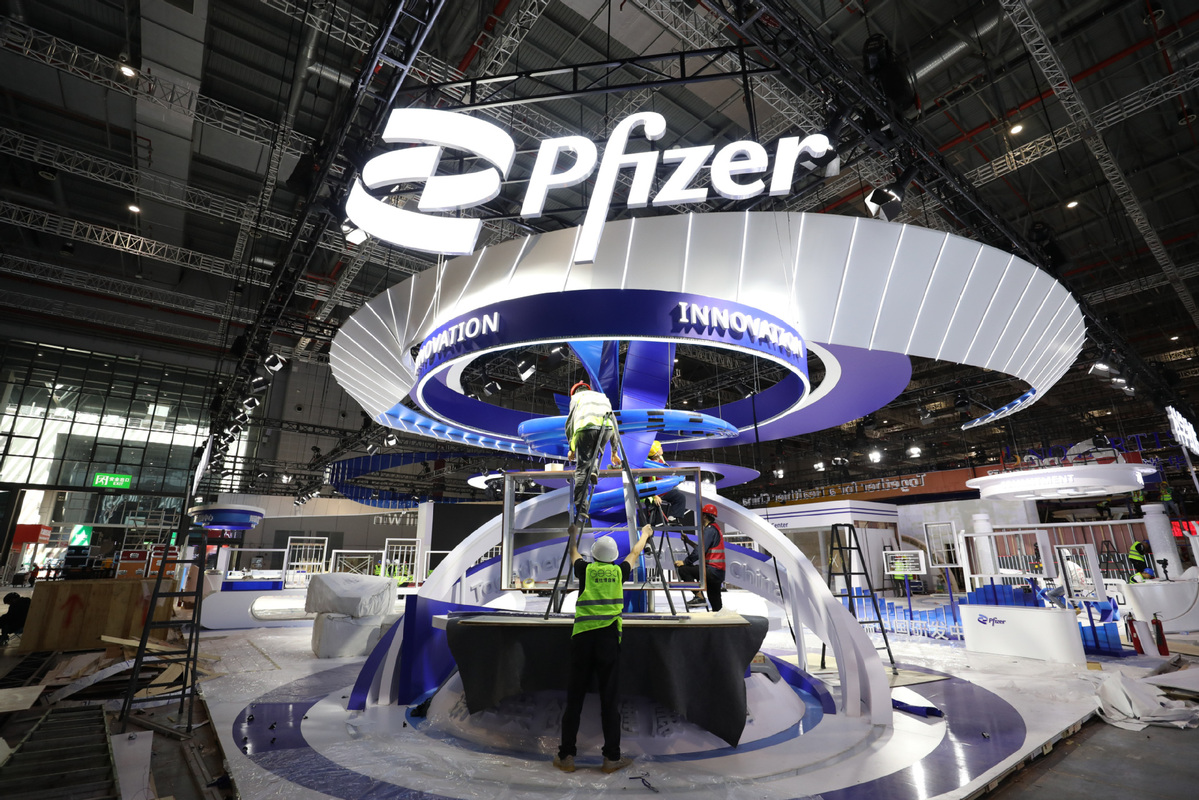 Workers set up an exhibition area at the National Exhibition and Convention Center (Shanghai), the main venue for the upcoming sixth China International Import Expo, in Shanghai, Oct 29, 2023. [Photo/Xinhua]