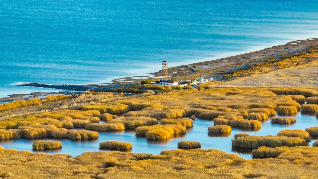 On Oct 31, the Bosten Lake wetlands in Xinjiang, unveiled a breathtaking sight! Autumn wetlands filled with hues of gold, where reeds dance in the shimmering sunlight. A mesmerizing view from above revealed golden reed beds and serene blue waters.