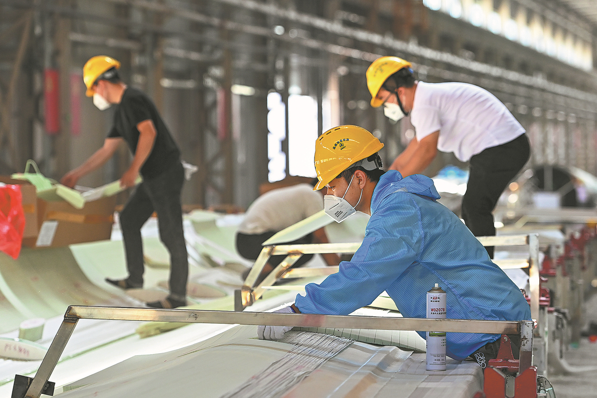 Employees work at a wind power equipment manufacturing company in Tacheng, Xinjiang Uygur autonomous region. [DING LEI/XINHUA]