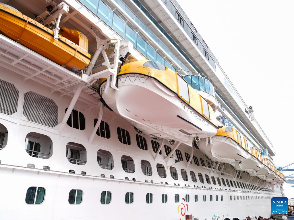 This photo taken on Nov 4, 2023 shows the exterior view of cruise ship "Adora Magic City" in Shanghai, east China. After five years of design, building and a subsequent trial voyage, China's first domestically-built large cruise ship, the "Adora Magic City," was delivered in Shanghai on Saturday, with its maiden voyage scheduled for Jan 1, 2024. [Photo/Xinhua]
