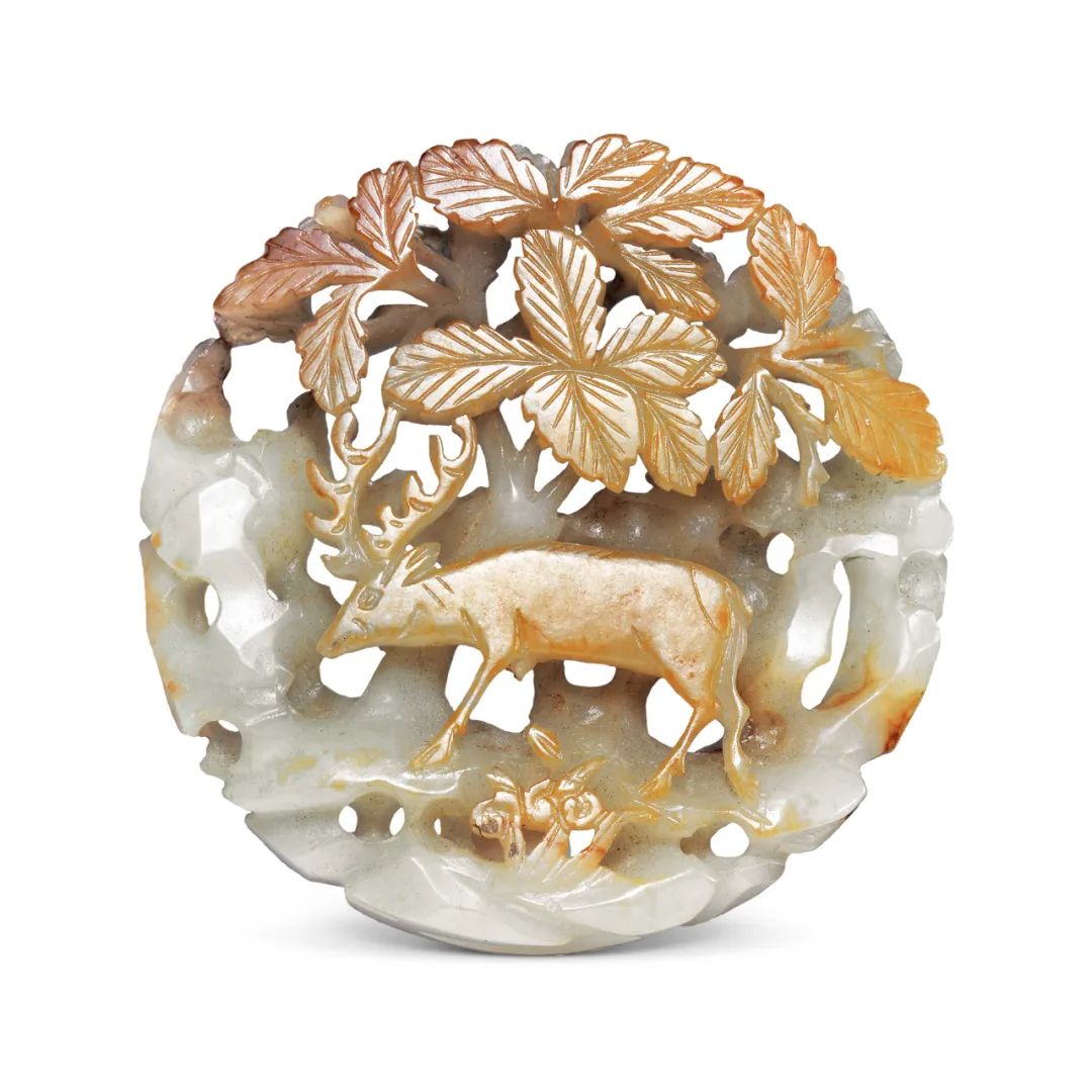 In the Jurchen Jin Dynasty (1115-1234), autumn was an opportune time for hunting for northern ethnic minorities. This white jade belt ornament is a fine example depicting the hunting scene, which makes good use of the original yellow of the jade to portray a plump deer under an oak tree in openwork. Lingzhi fungus and rocks are also carved around the deer. Well-balanced and intricately carved, this jade piece is a treasure in the permanent collection of the National Museum of China.