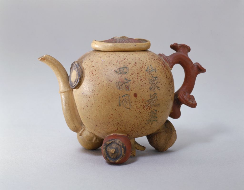 It has a round body in the shape of an upside-down pomegranate, a mushroom-shaped lid, a lotus stem-shaped spout, and a lingzhi fungus-shaped handle. A melon seed is attached to the shoulder. A persimmon, a peach and a walnut serve as its three feet. A seven-character inscription is engraved on the belly. This rare and exquisite water dropper is in the permanent collection of the Palace Museum.