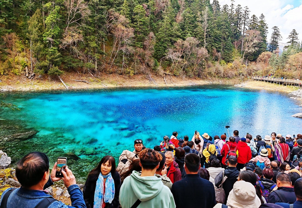 In autumn, the Jiuzhaigou Valley Scenic and Historic Interest Area in Sichuan province is adorned with azure skies, emerald waters, and golden leaves. What a picturesque landscape!