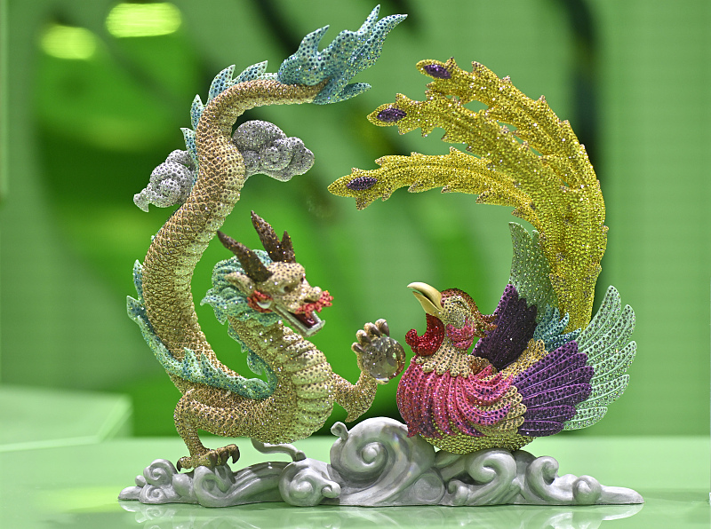 People can see various artworks including a crystal dragon and phoenix, a porcelain teapot and zodiac ornaments.