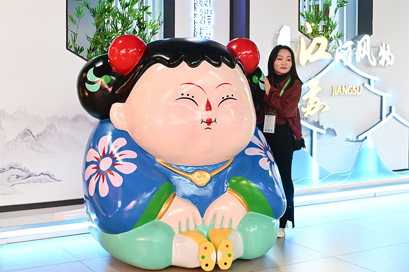 A visitor takes photos with a clay figurine at the China International Import Expo in Shanghai on Nov 8, 2023. [Photo/VCG]