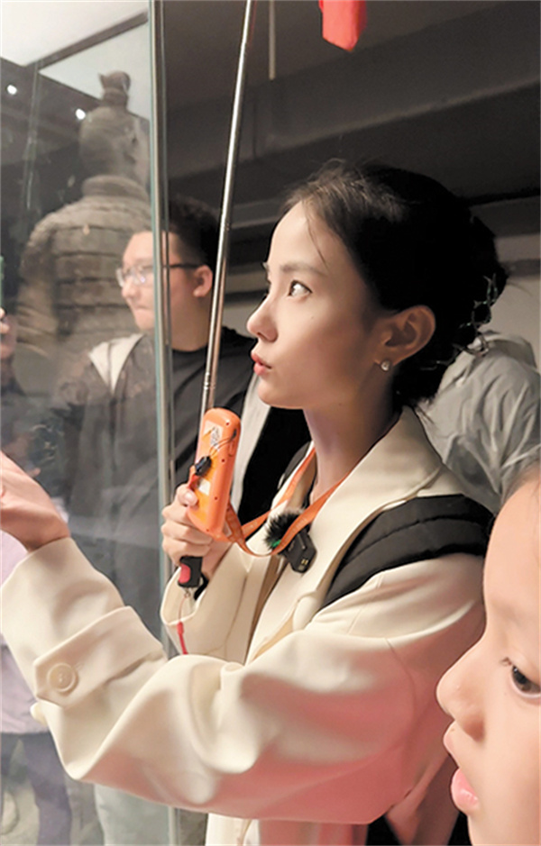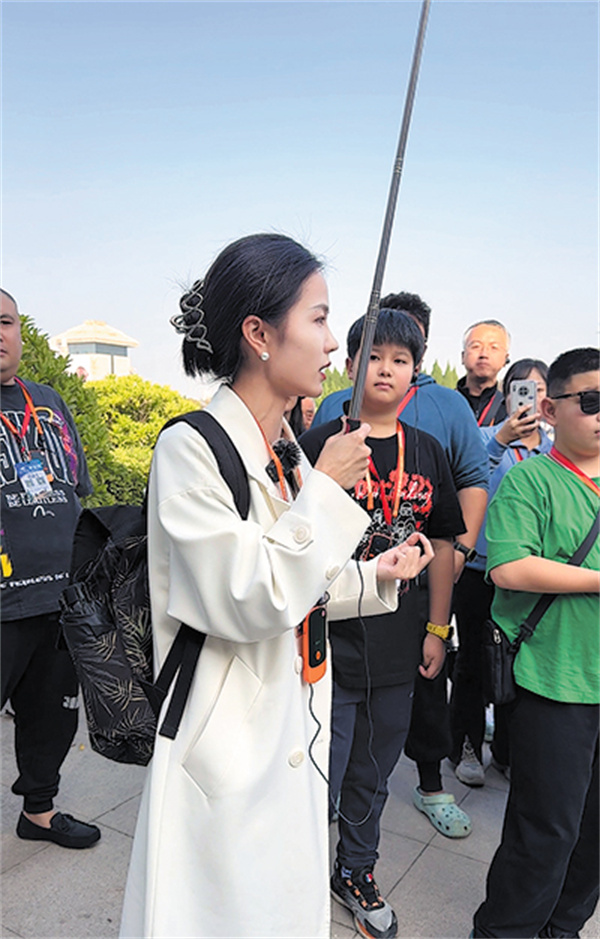 Tour guide Wang Yu explains the historical background and details of specific cultural relics to visitors at the Emperor Qinshihuang's Mausoleum Site Museum in Xi'an, Shaanxi province.[Photo provided to China Daily]