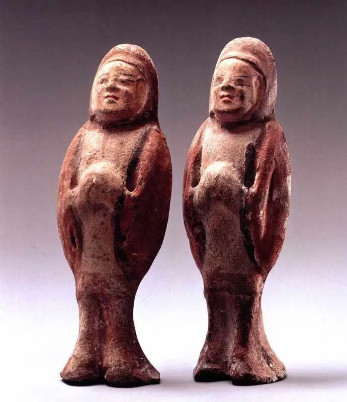 A pair of 6th century painted pottery figurines wearing hoods