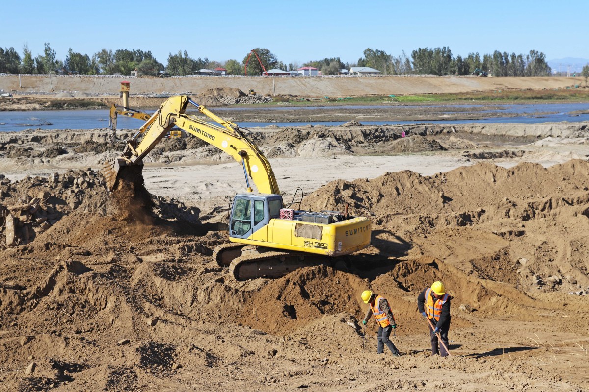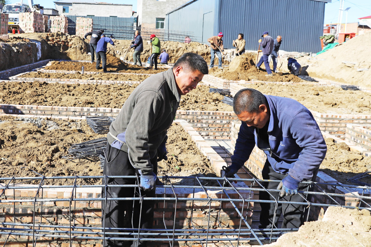 In Wanquanzhuang village of Diaowo town, located in a flood detention and storage area, residents and construction workers worked tirelessly on Sunday, mixing mortar and laying bricks reinforced by steel bars.