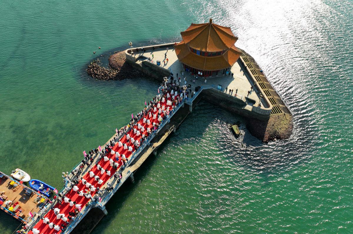 A group wedding ceremony is held at the century-old Zhanqiao Pier in Shinan district of Qingdao, Shandong province on Sunday. [Photo by Wang Haibin/for chinadaily.com.cn]