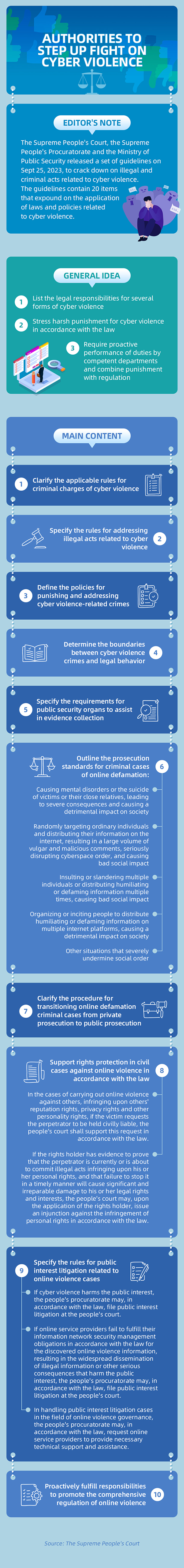 Editor's note: The Supreme People's Court, the Supreme People's Procuratorate and the Ministry of Public Security released a set of guidelines on Sept 25, 2023, to crack down on illegal and criminal acts related to cyber violence. The guidelines contain 20 items that expound on the application of laws and policies related to cyber violence.