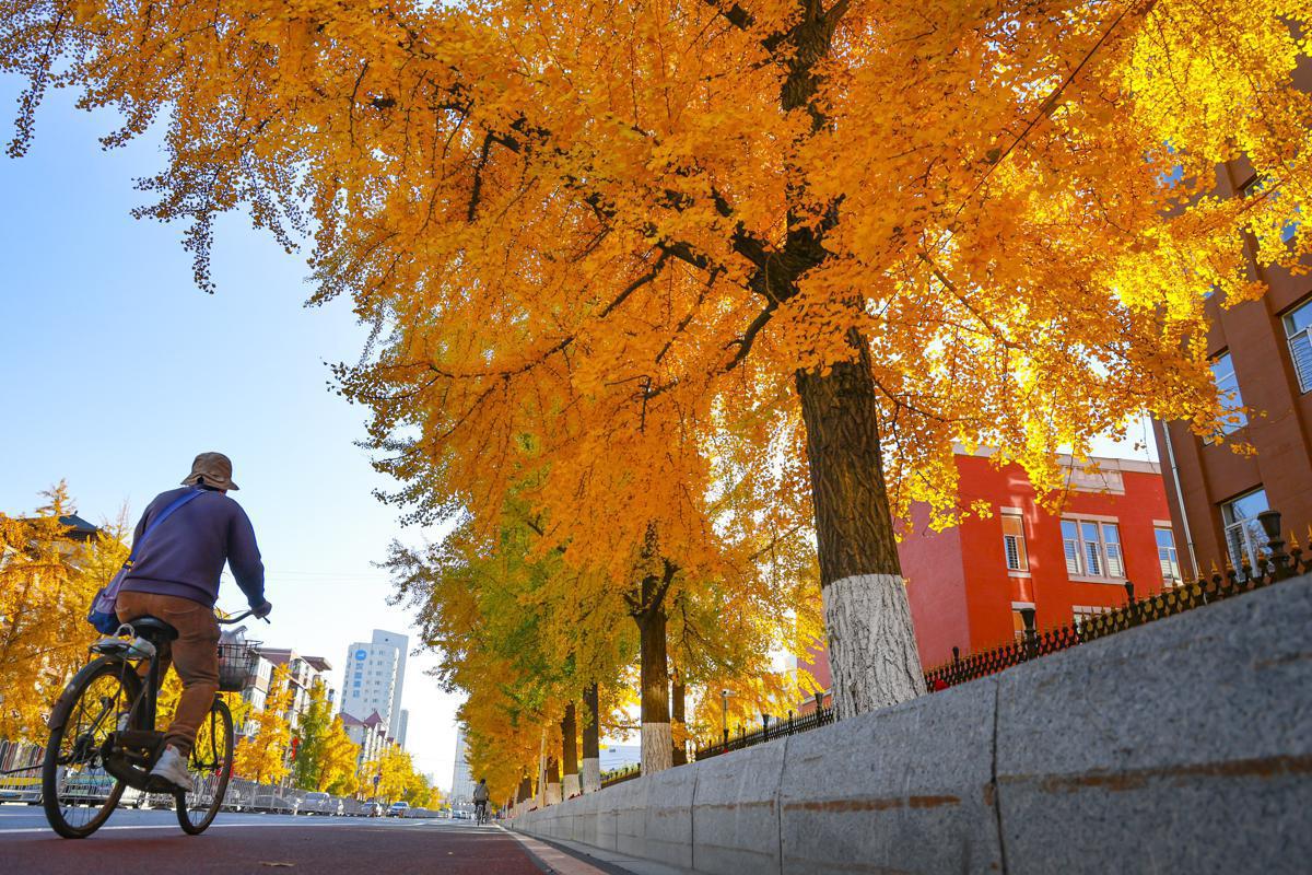 The ginkgo trees along the streets and the riverside campus of Liaodong University in Dandong, Liaoning province, have donned a thick layer of golden attire, shining brightly under the sunlight.