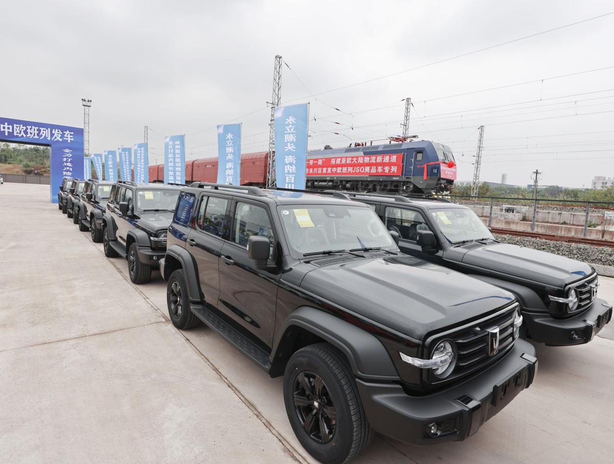 A specially designed freight train prepares to depart from Chongqing's Yongchuan district on Tuesday. The train is loaded with 232 vehicles manufactured by Great Wall Motors in Yongchuan valued at about 42 million yuan ($5.76 million). [Photo by Ao Minji/For chinadaily.com.cn]