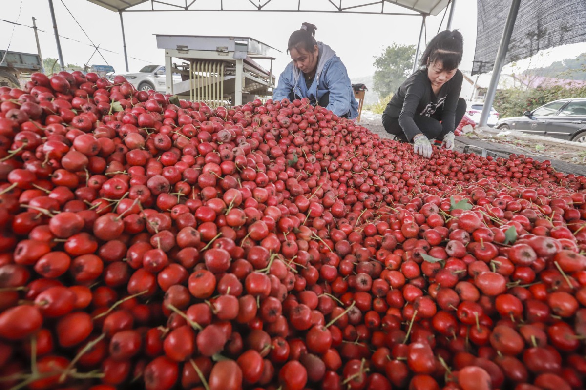 Farmers in Zunhua, Tangshan, Hebei province, have recently been busy processing hawthorn fruits after their autumn harvest, preparing them to be purchased by customers.