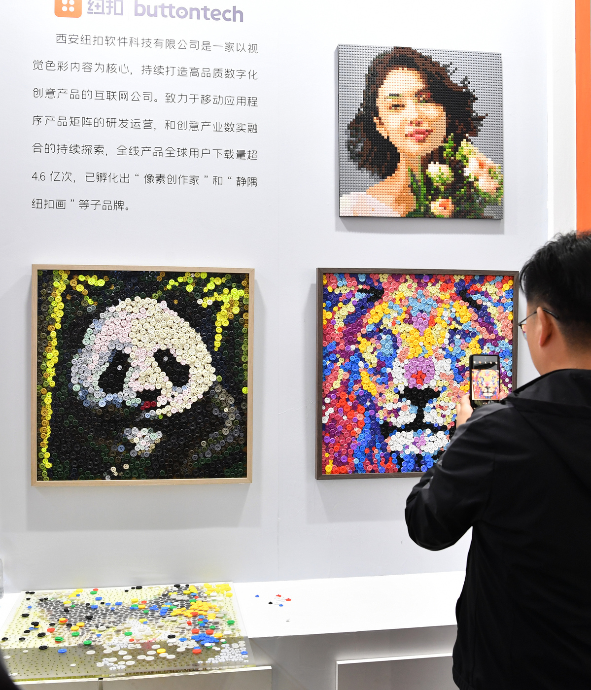 A visitor views cultural and creative products made of buttons during the Seventh Silk Road International Exposition in Xi'an, capital of Northwest China's Shaanxi province, on Nov 16, 2023. [Photo/Xinhua]