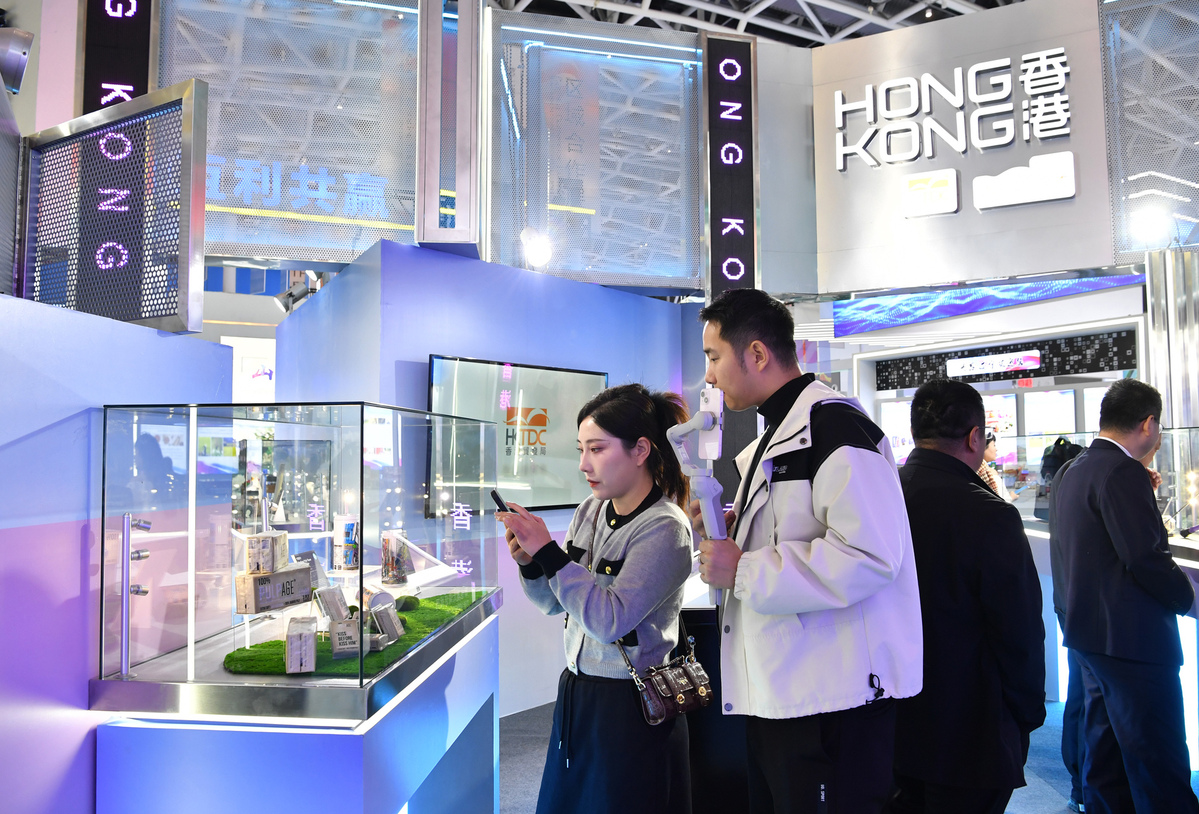Visitors view exhibits at the booth of South China's Hong Kong during the Seventh Silk Road International Exposition in Xi'an, capital of Northwest China's Shaanxi province, on Nov 16, 2023. [Photo/Xinhua]