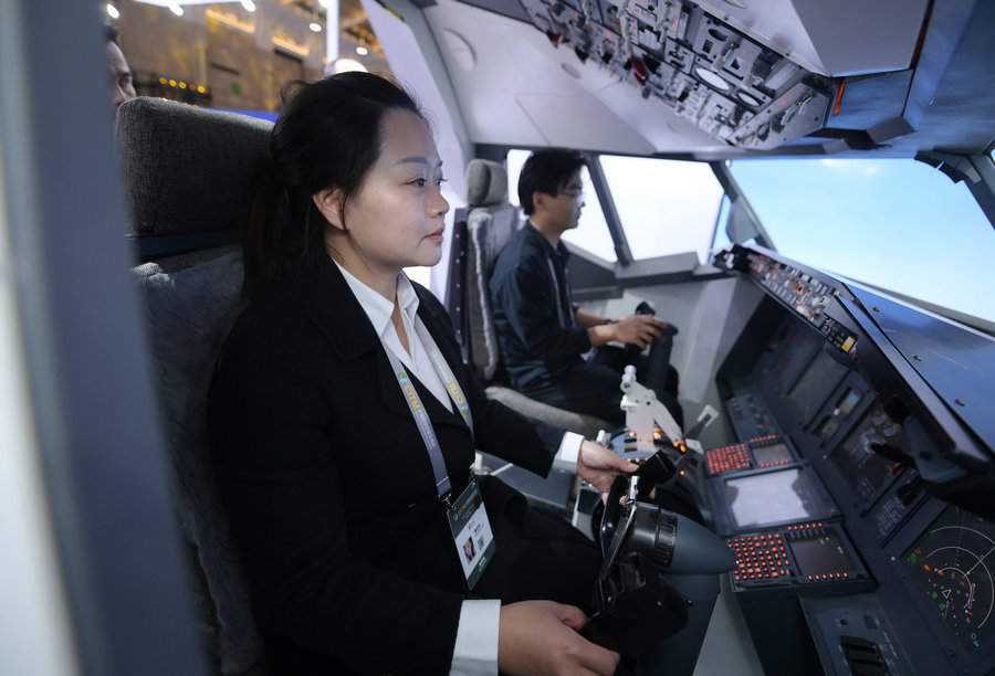 Visitors experience piloting simulation at the booth of Air China during the China International Travel Mart 2023 in Kunming, Southwest China's Yunnan province, Nov 17, 2023. [Photo/Xinhua]