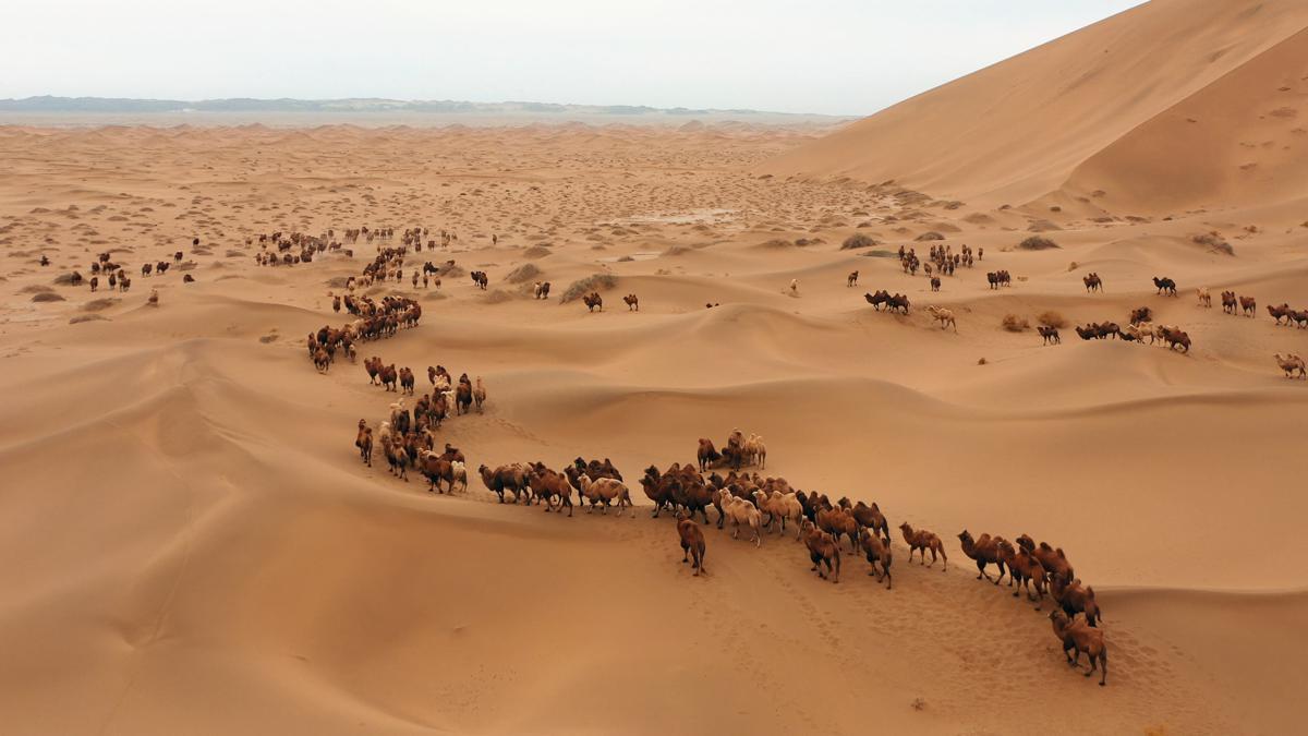 Every spring and summer, herders release camels into the desert, where the ecological conditions are suitable for their survival. As winter approaches, the herders drive the camels out of the desert and into winter pastures, ensuring the safe passage of the camel herd through the winter season.