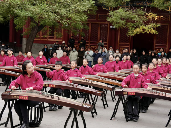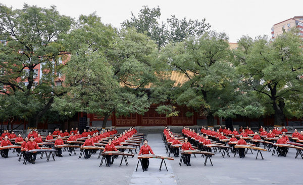 Bringing to an end the monthlong 10·15 Art Festival, some 100 guzheng (a plucked-string musical instrument) players performed at the Central Conservatory of Music in Beijing on Nov 15.