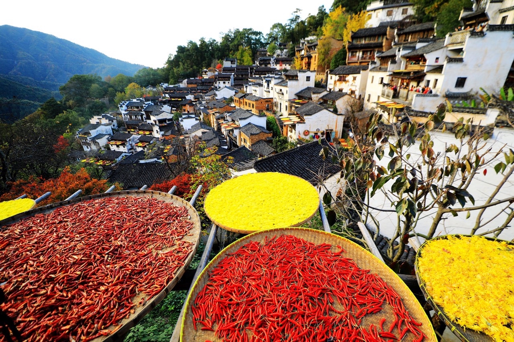 Embark on a visual journey to Huangling village in Jiangwan town, Wuyuan county, Shangrao city, Jiangxi province! Villagers are drying red peppers, pumpkins, winter melons, corn, and rice on the roofs of Hui-style buildings, creating a stunning winter tableau.