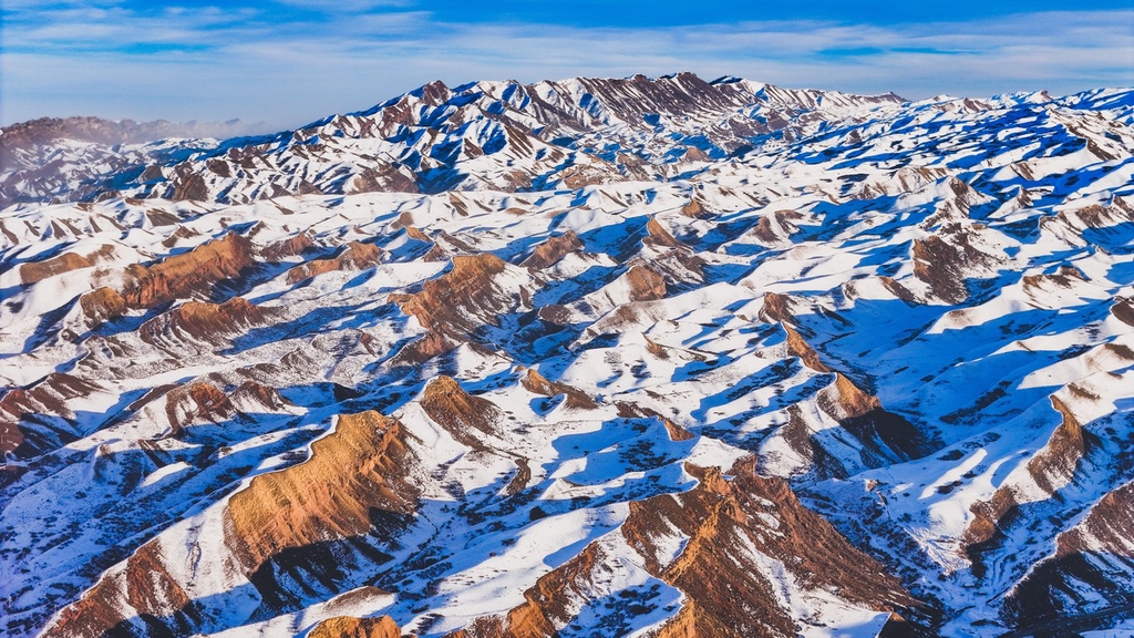 Discover the enchanting beauty of the Baili Danxia scenic area in Hutubi county, Xinjiang! Wrapped in silver, with vibrant colors and misty clouds among the mountains, it's a breathtaking sight. The reddish Danxia landforms, set against distant snow-capped mountains, create a truly magnificent painting.
