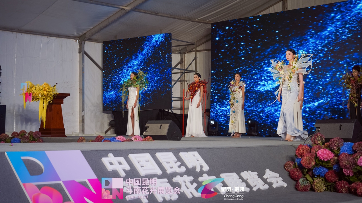 Models adorn in stunning floral creations at the 2023 China Kunming Dounan Flower Exhibition. [Photo/The Chenggong District Convergence Media Center]