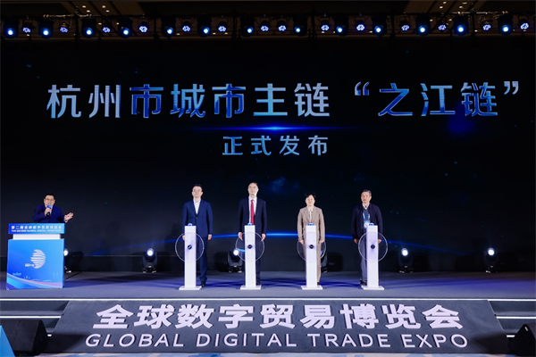 The Zhejiang Chain, Hangzhou's next-generation urban digital infrastructure, was officially launched during the blockchain session at the 2023 Global Digital Trade Expo on Nov 25.