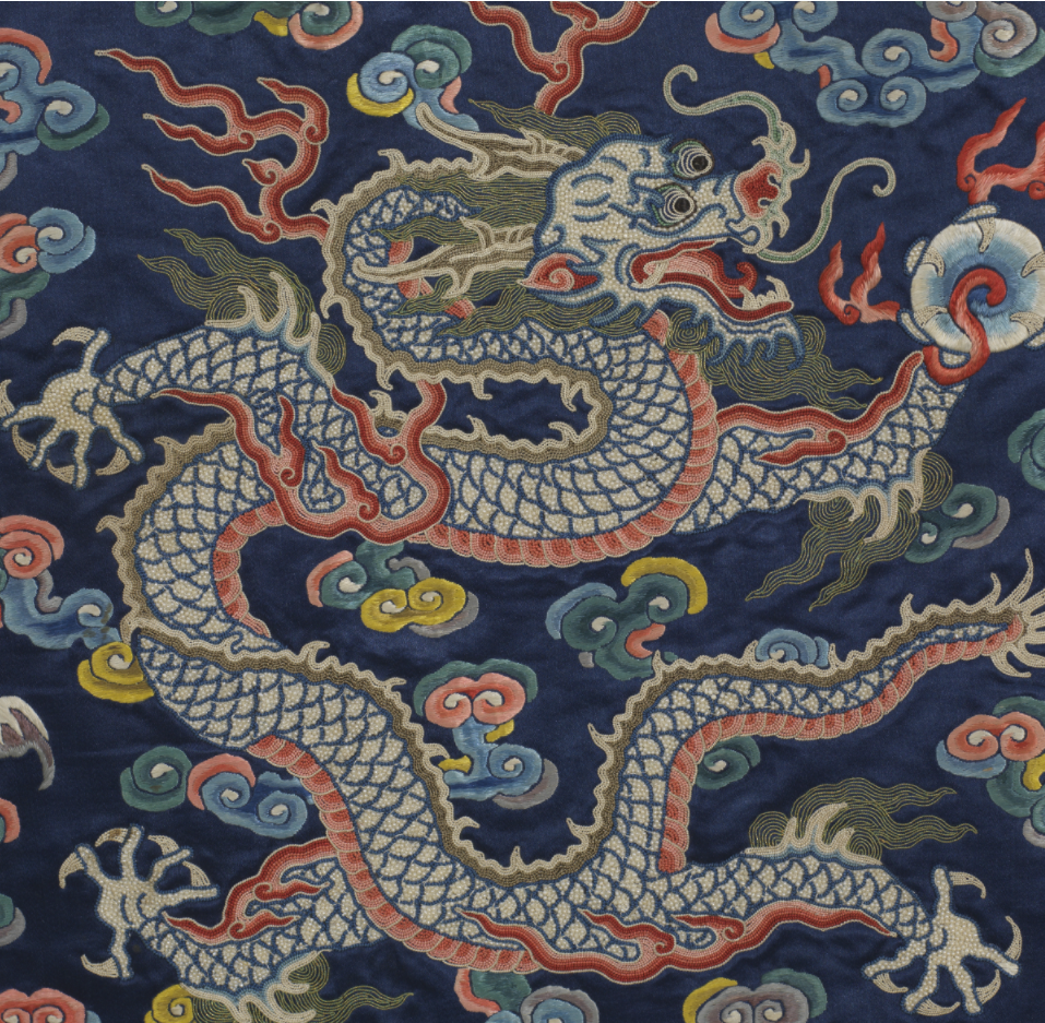 Detail of a blue satin robe adorned with embroidery of clouds and dragons, Qing Dynasty [Photo/Official WeChat account of the Suzhou Museum]