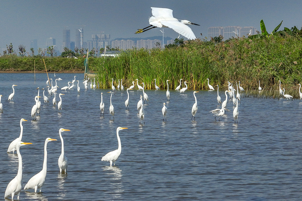 The picturesque landscape of Longxue Island in Nansha district, Guangzhou, was recently graced by the arrival of migratory birds on their southward journey. Among them were national first-level protected birds such as the black-faced spoonbill, and national second-level protected fowl such as the egret.
