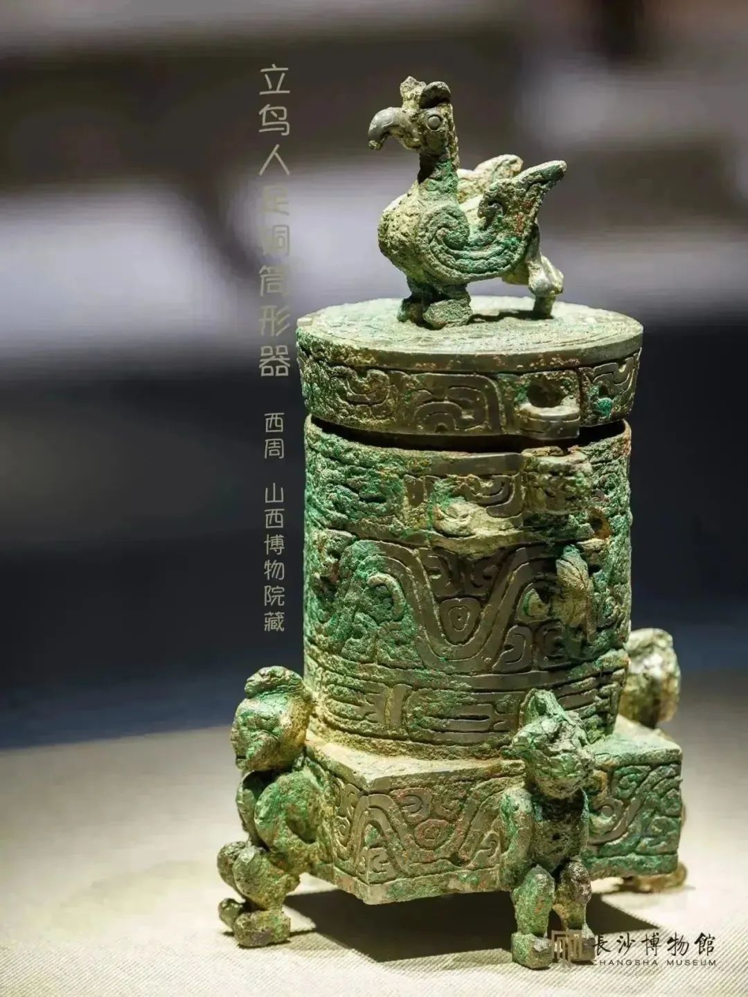 A bronze cylindrical vessel with a bird-shaped knob and three man-shaped feet, Western Zhou Dynasty, from the collection of the Shanxi Museum [Photo/Official WeChat account of the Changsha Museum]