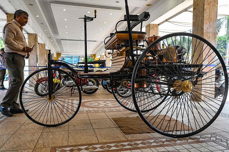 A visitor looks at a 'Benz Patent motor wagon 1886', at a heritage car show in Chennai, India on Dec 17, 2022. [Photo/VCG]