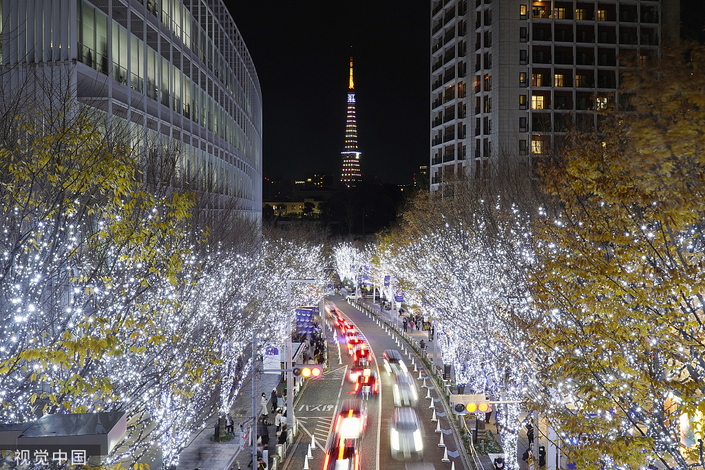 This photo dated Dec 16, 2022, shows the Christmas illuminations of Keyakizaka street in Roppongi Hills, the commercial and entertainment district of Tokyo, and the illuminated Tokyo Tower in Tokyo, Japan. [Photo/VCG]