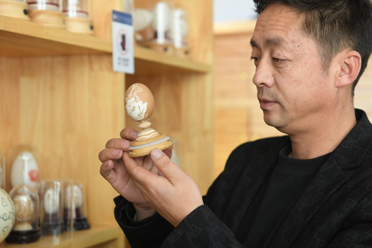 Yang Xingguo, a tutor at Lanzhou University of Resources and Environment, shows his eggshell carvings. [Photo by Dai Wenchang for chinadaily.com.cn]