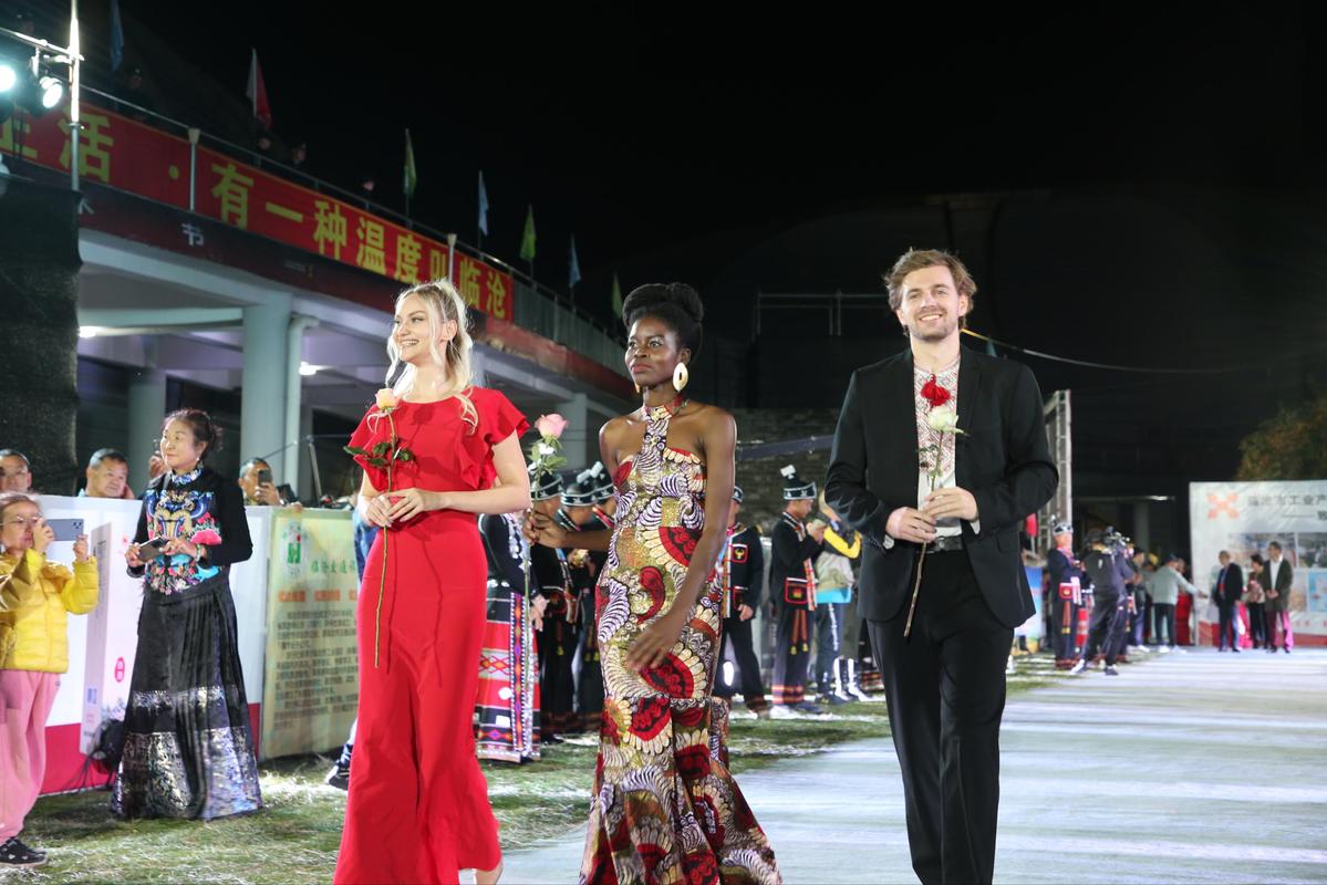 Three foreigners hold Yunnan roses as they enter the venue at the 10th Asia Microfilm Art Festival in Lincang city, Yunnan province. [Photo provided to chinaservicesinfo.com]
