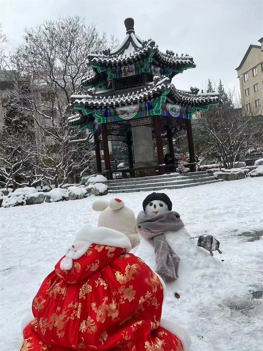 A resident in Beijing enjoys the first snow of the winter on Monday. [Photo provided to chinadaily.com.cn]