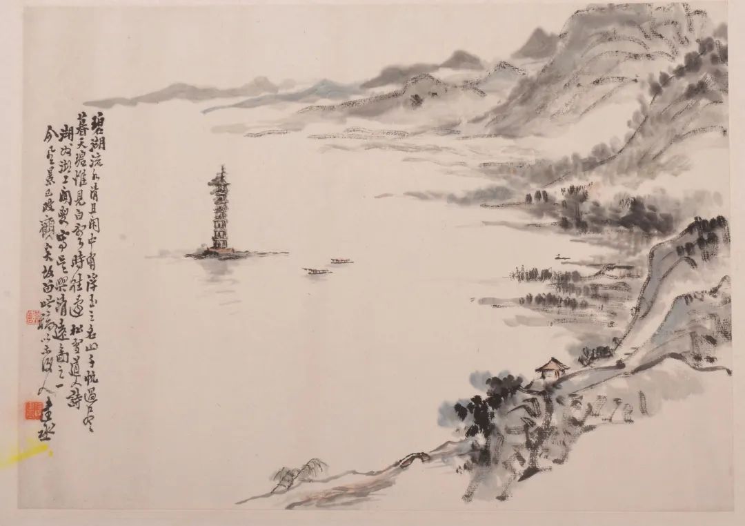 Through the artistry of painter Tan Jiancheng, one can almost imagine being in Huzhou, facing the sparkling waves of Bilang Lake, gazing into the distance at the Ming Dynasty (1368-1644) brick Fuyu pagoda, immersing one’s self in one of the famous Wuxing Eight Scenic Spots beloved by literati throughout history.