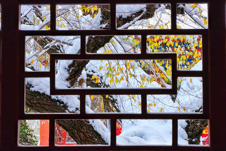 The Chenghuang Temple in Zhengzhou, Henan province, adorned with snow, exudes a sense of serenity and tranquility. [Photo by Wang Yi / For chinadaily.com.cn]