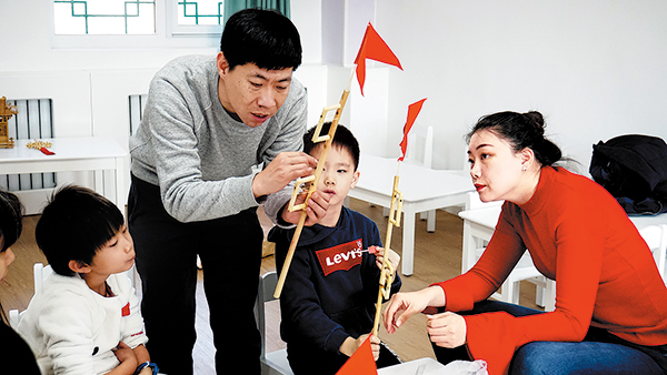 Xu teaches pupils to make windmill toys at a kindergarten in Beijing.[Photo provided to China Daily]