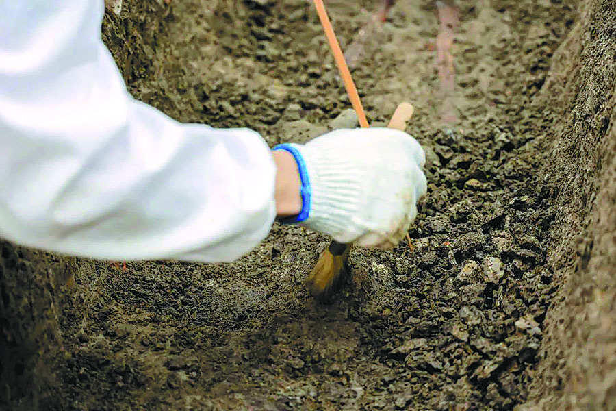 Archaeologists excavate two tombs from the Majiabang Culture at the Ma'an site, where two ancient human skeletons were found, and later ancient DNA from one of them was successfully extracted. [Photo provided to China Daily]