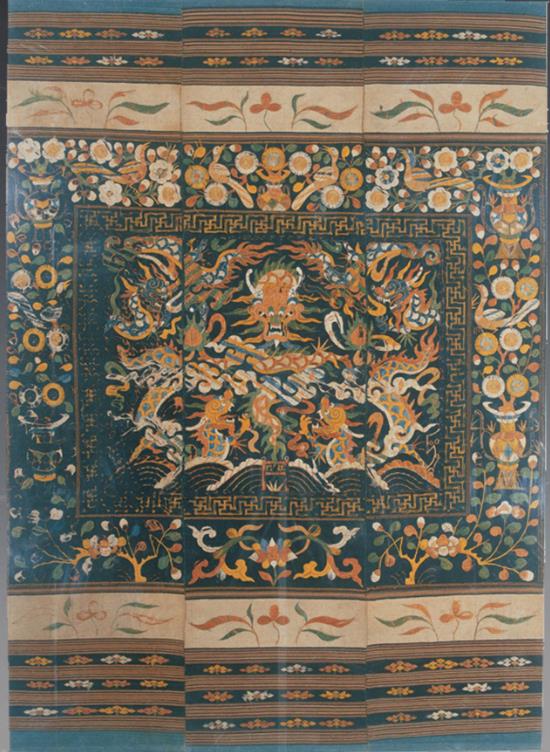 This Qing Dynasty (1644-1911) dragon quilt is intricately woven and embroidered by hand, using yellow, white, green and brown threads, and depicting five dragons in the sea. Auspicious patterns surround the dragons, including magpies perching on plum blossoms, vases, quails, lingzhi fungus and grass.