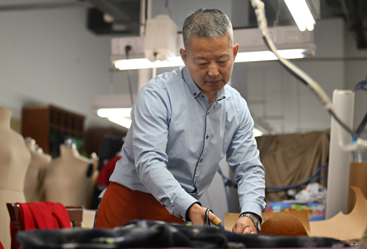 Gan Yongliang, the inheritor of the sleeved menswear making technique of time-honored brand Laomeihua, cuts cloth to make clothes in Tianjin on Dec 11, 2023. [Photo/Xinhua]