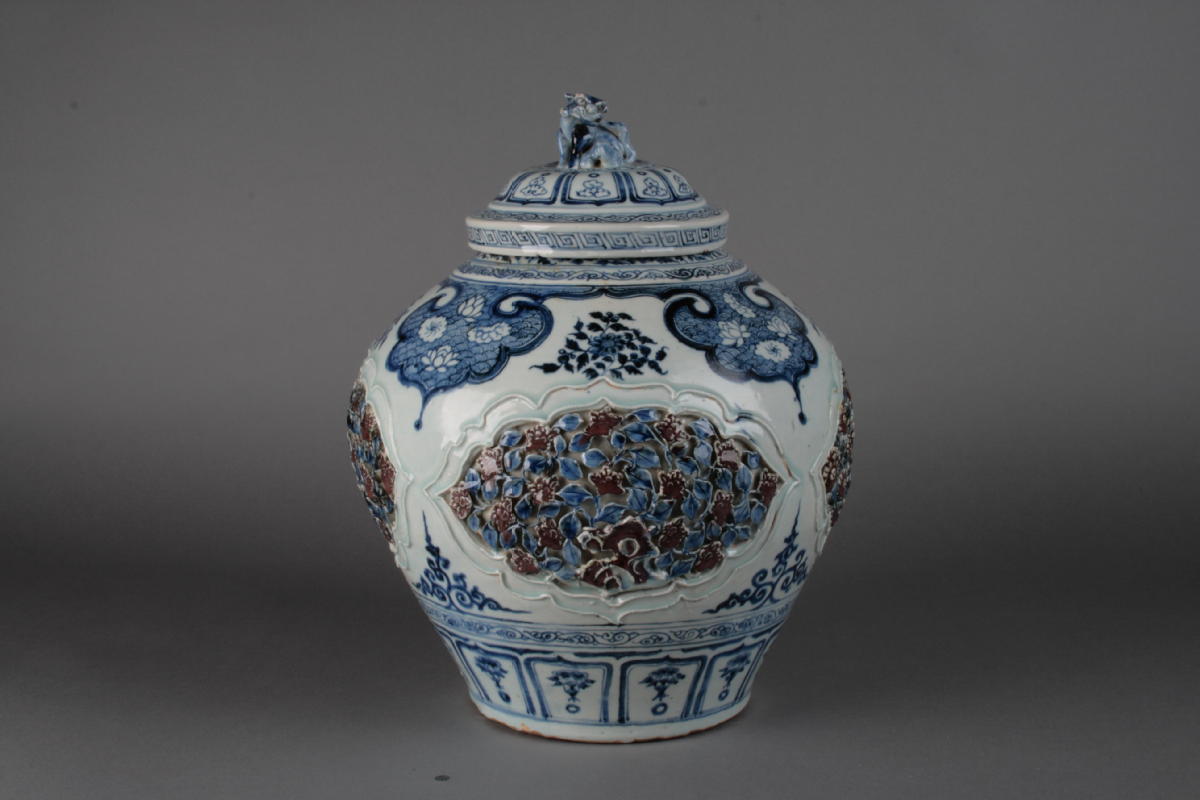 Behold this exquisite Yuan Dynasty (1271-1368) ceramic jar, featuring a range of intricate decorative techniques. It has a lid with a mythical creature-shaped knob. Its neck is embellished with a band of interlocking peonies, and its shoulder showcases scrolling vine patterns and large cloud motifs.