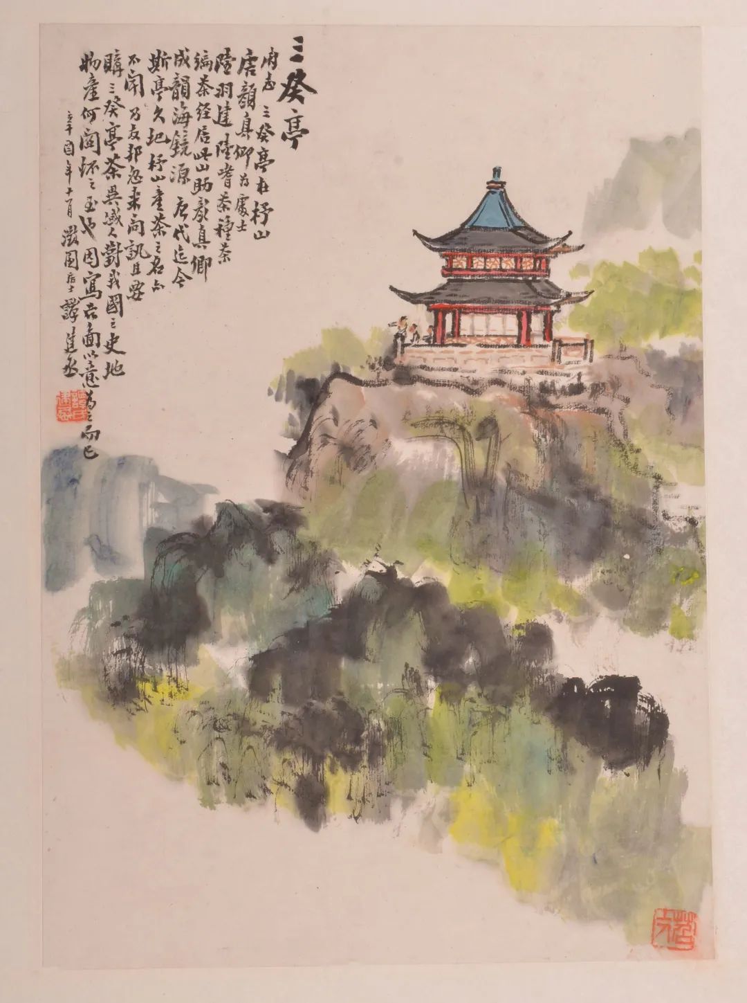 The Sangui Pavilion depicted by painter Tan Jiancheng exhibits rich and contrasting brushwork and a vivid reproduction of the pavilion’s former splendid scenery of lush trees and its elegance.